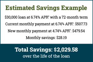Love your current vehicle but ready to trade in your old rate? We’ve got a special refinancing program just for you. Trade in your existing auto loan from another financial institution for a new loan with Argent and potentially lower your rate and monthly payment.